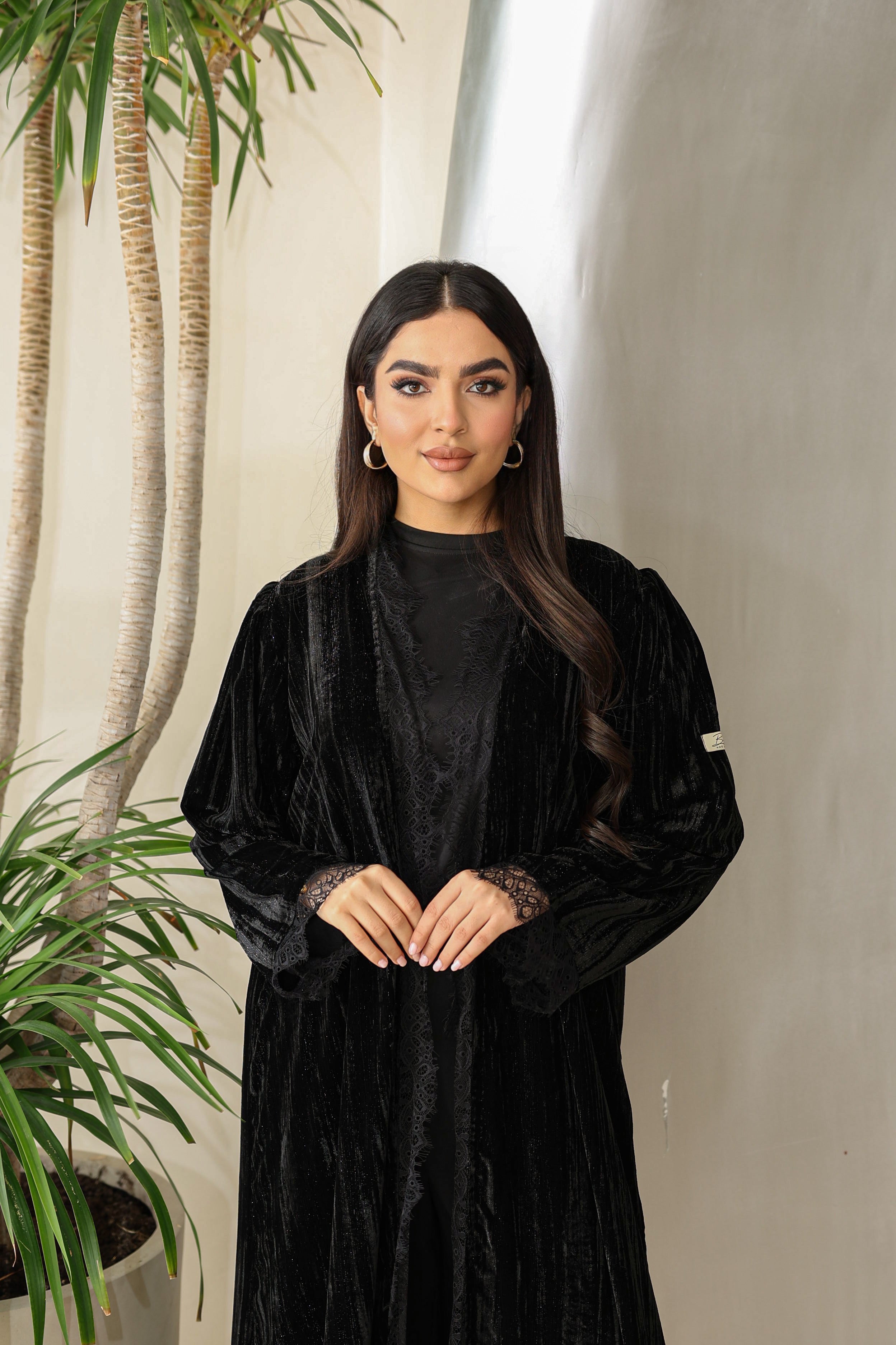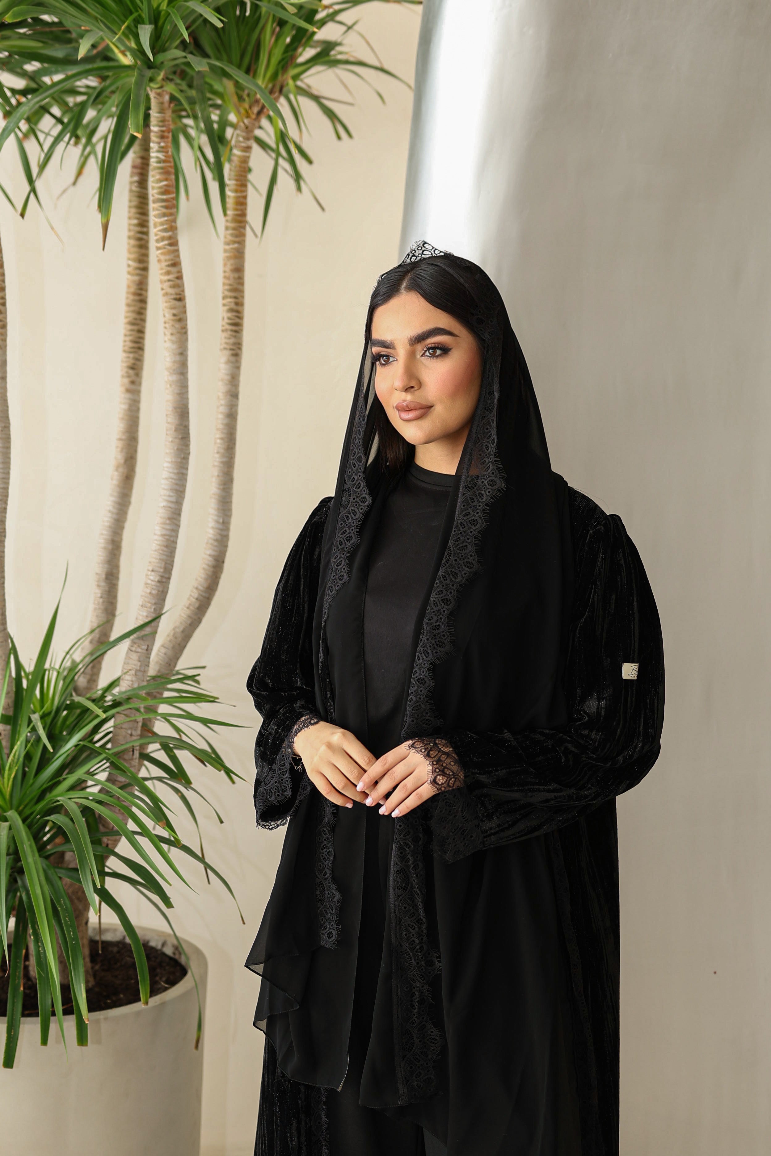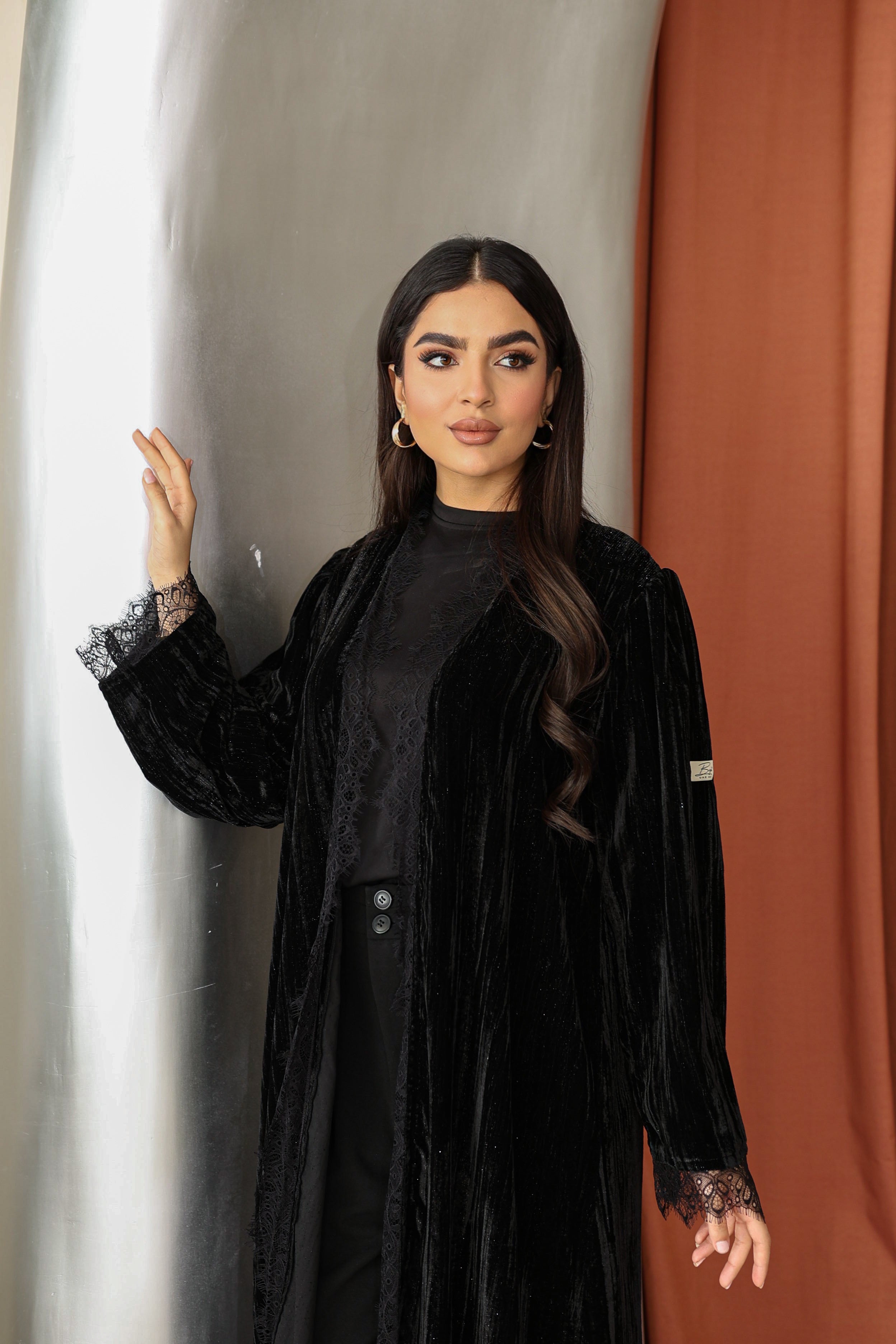 عبايه شتوية مخمل كسرات فيها دانتيل ومع شيلة