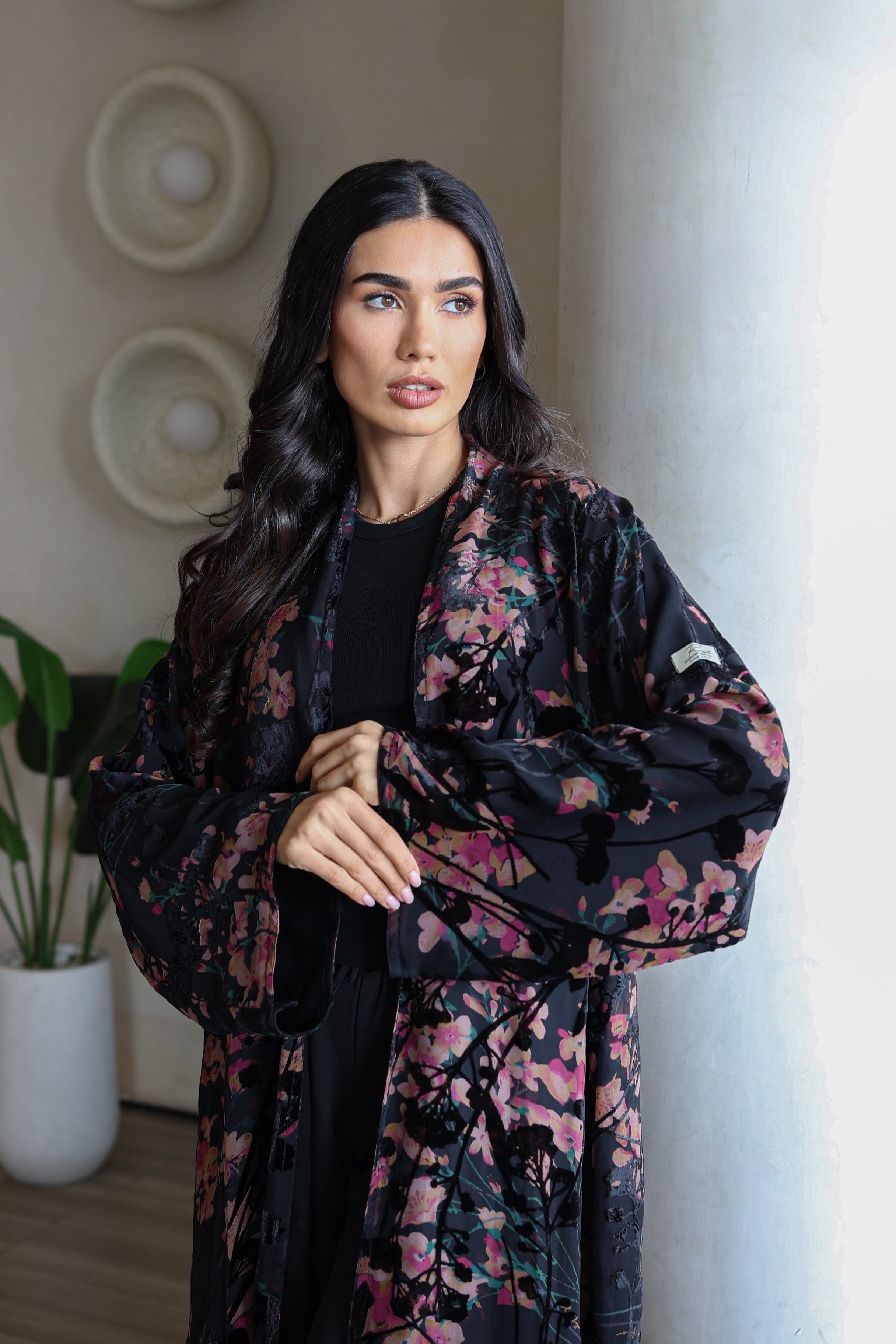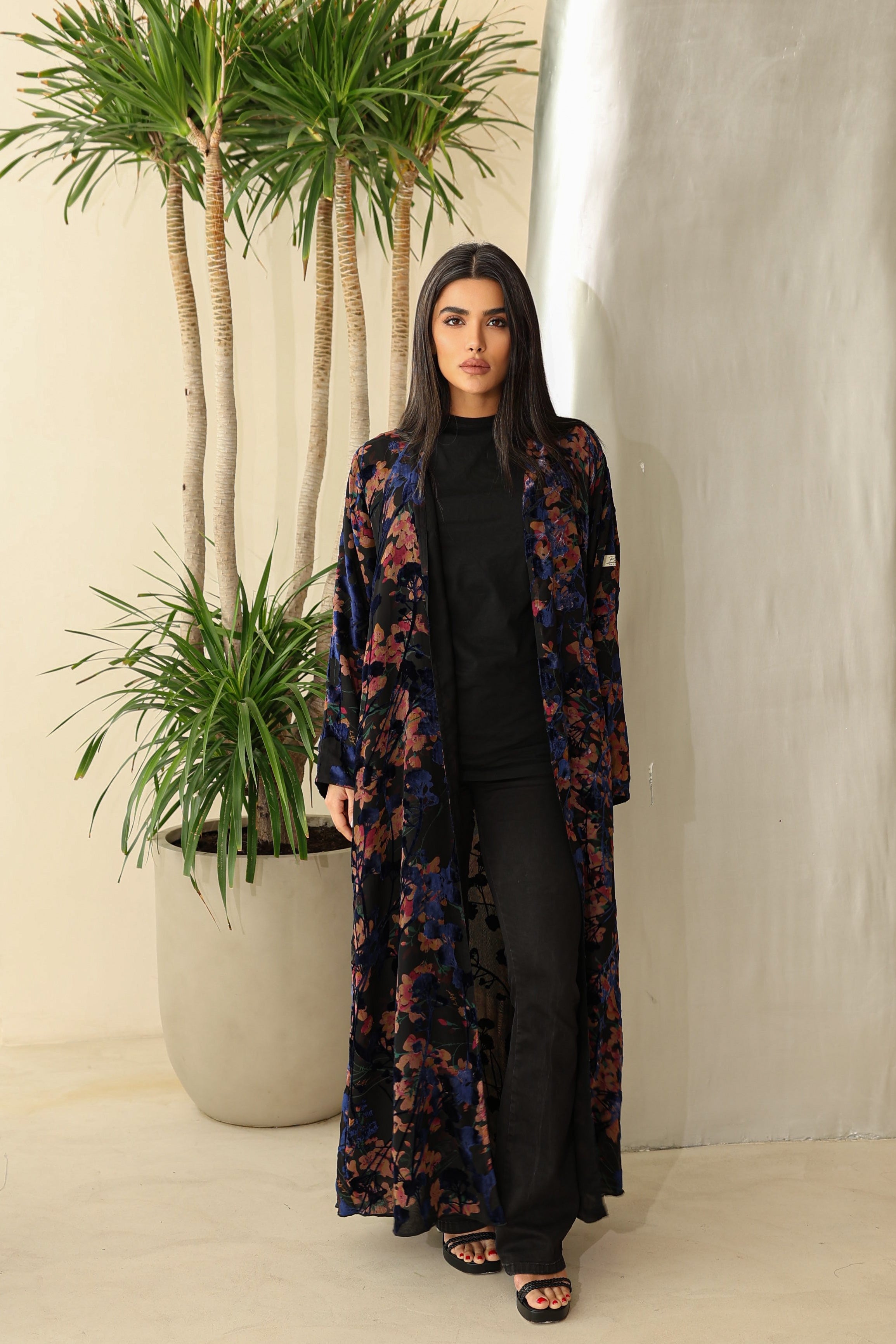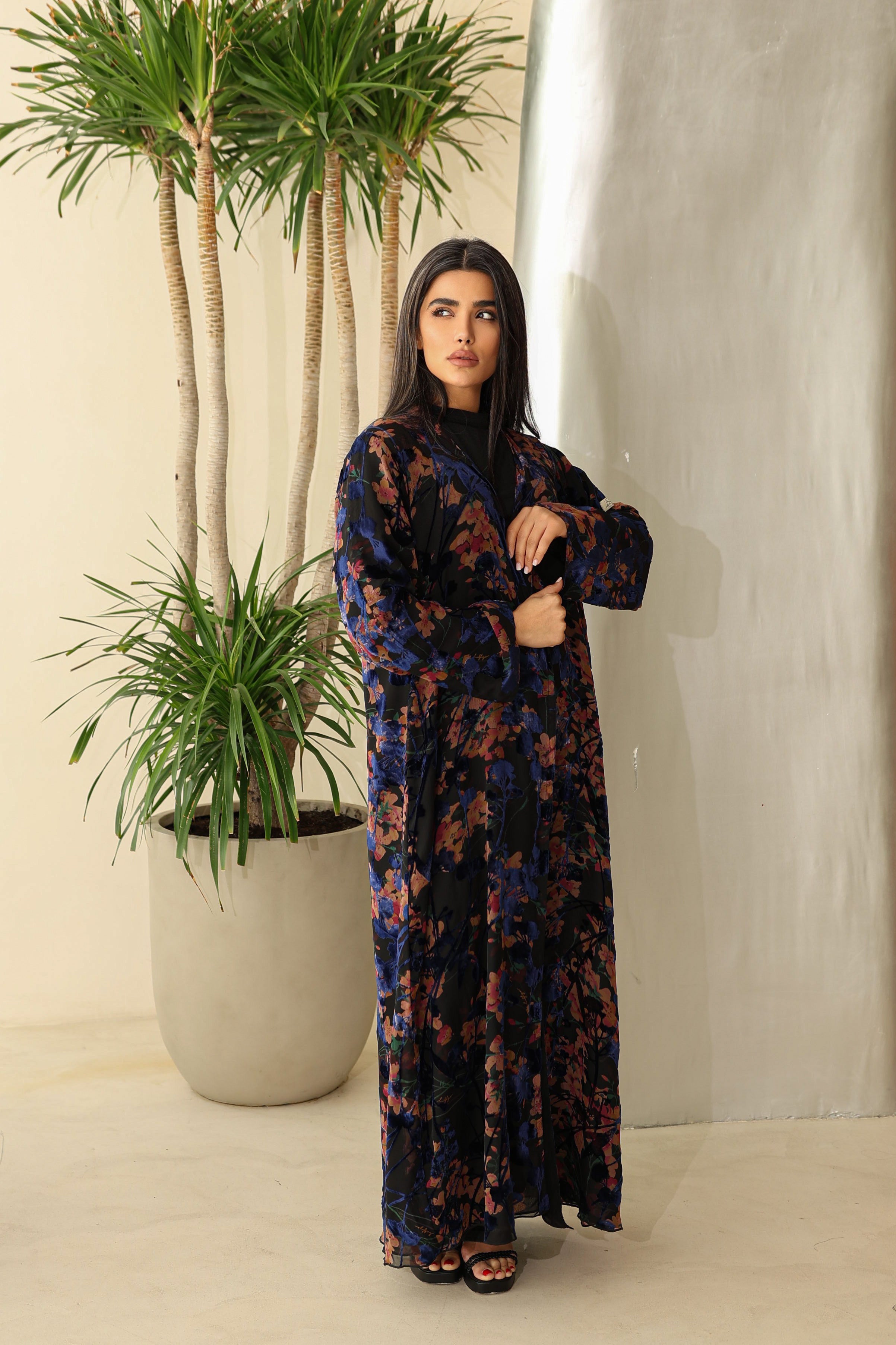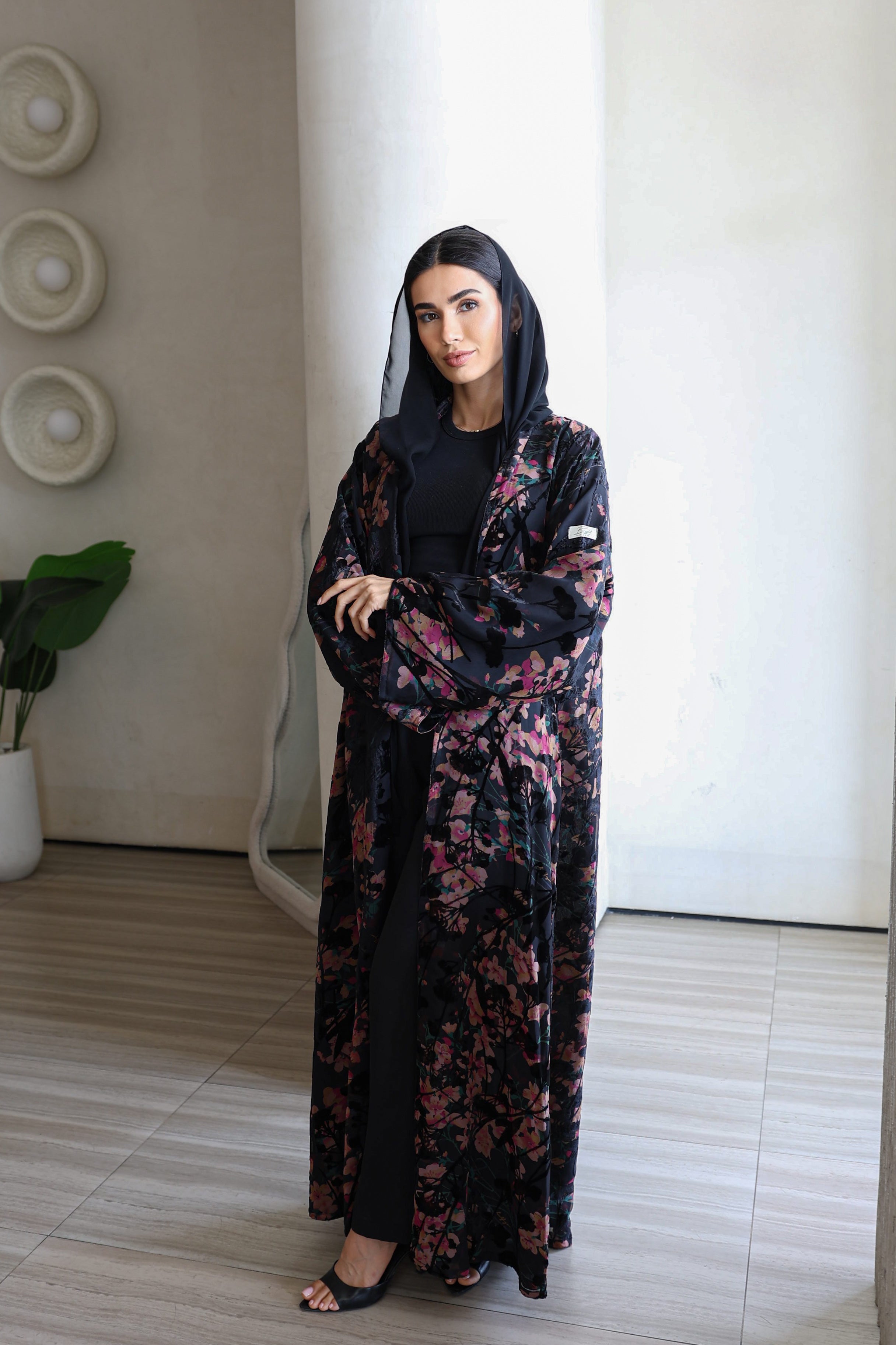 عبايه دبل شيفون مخمل بطبعة ورد مع شيله