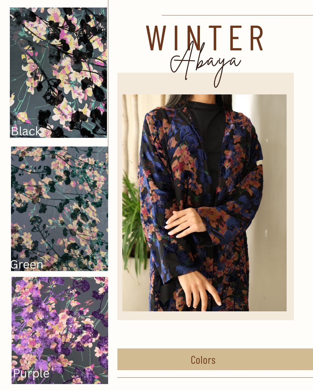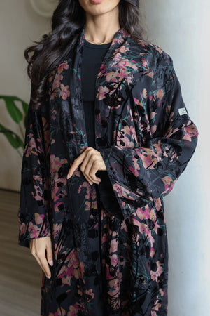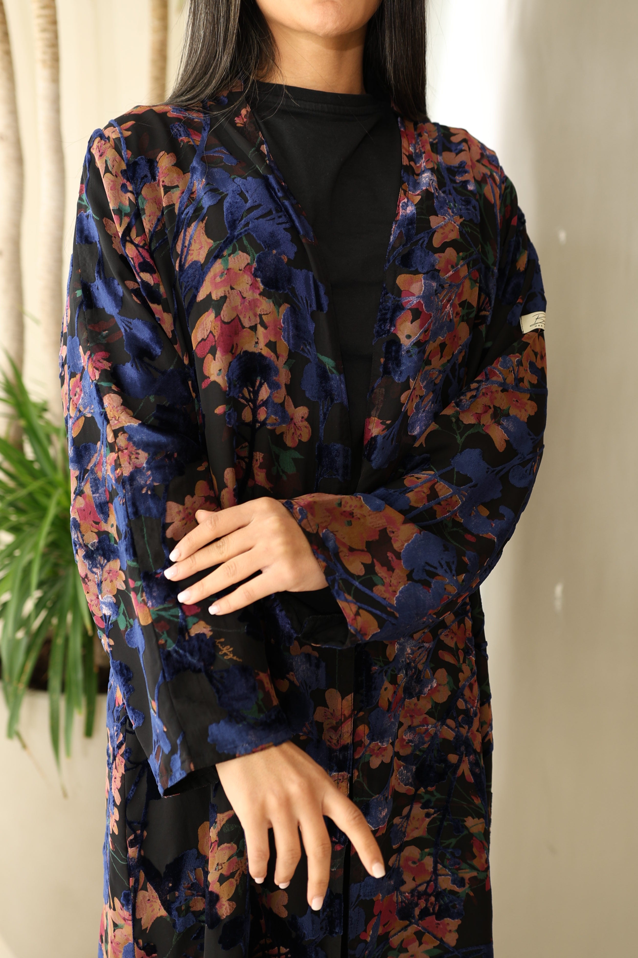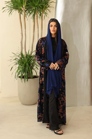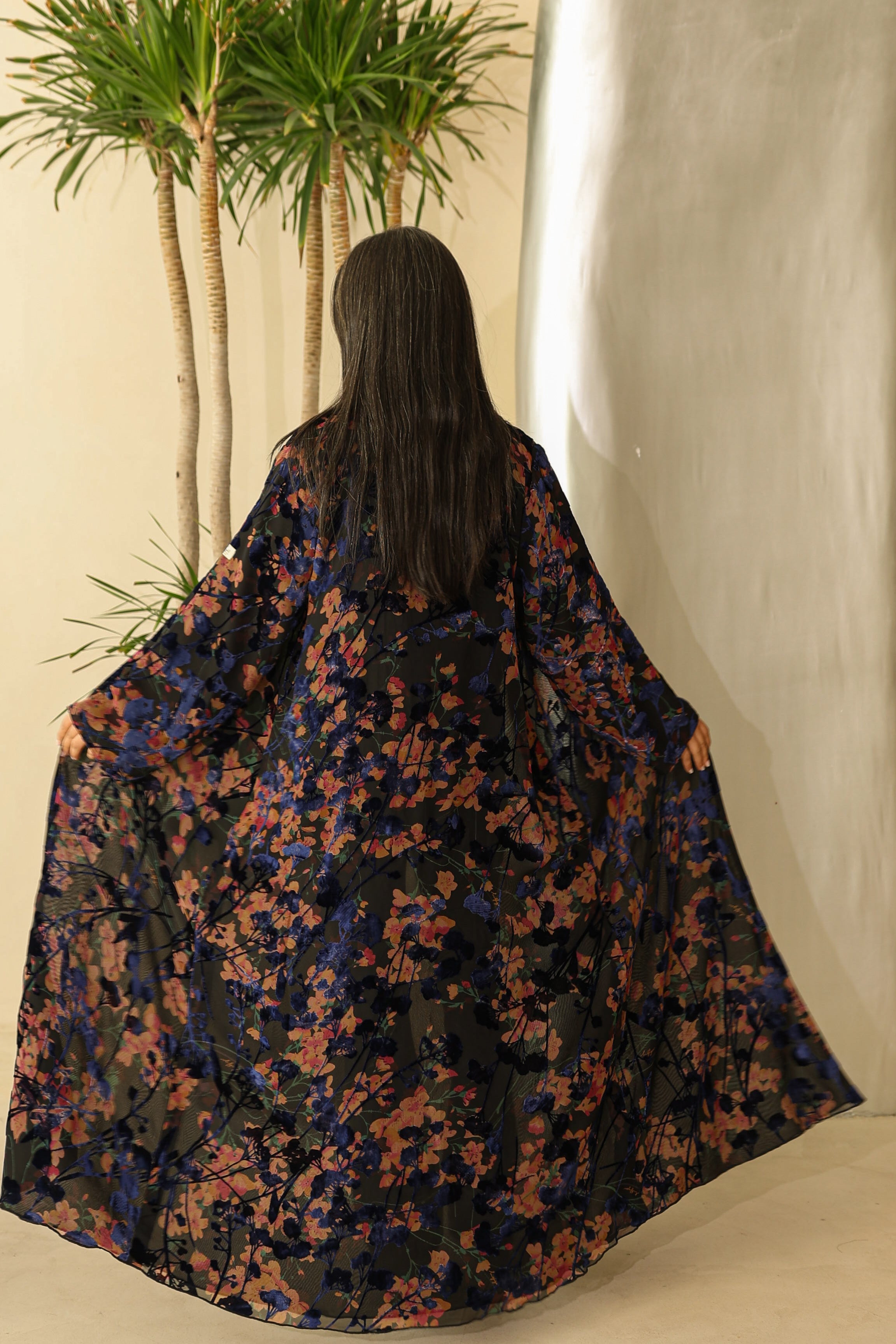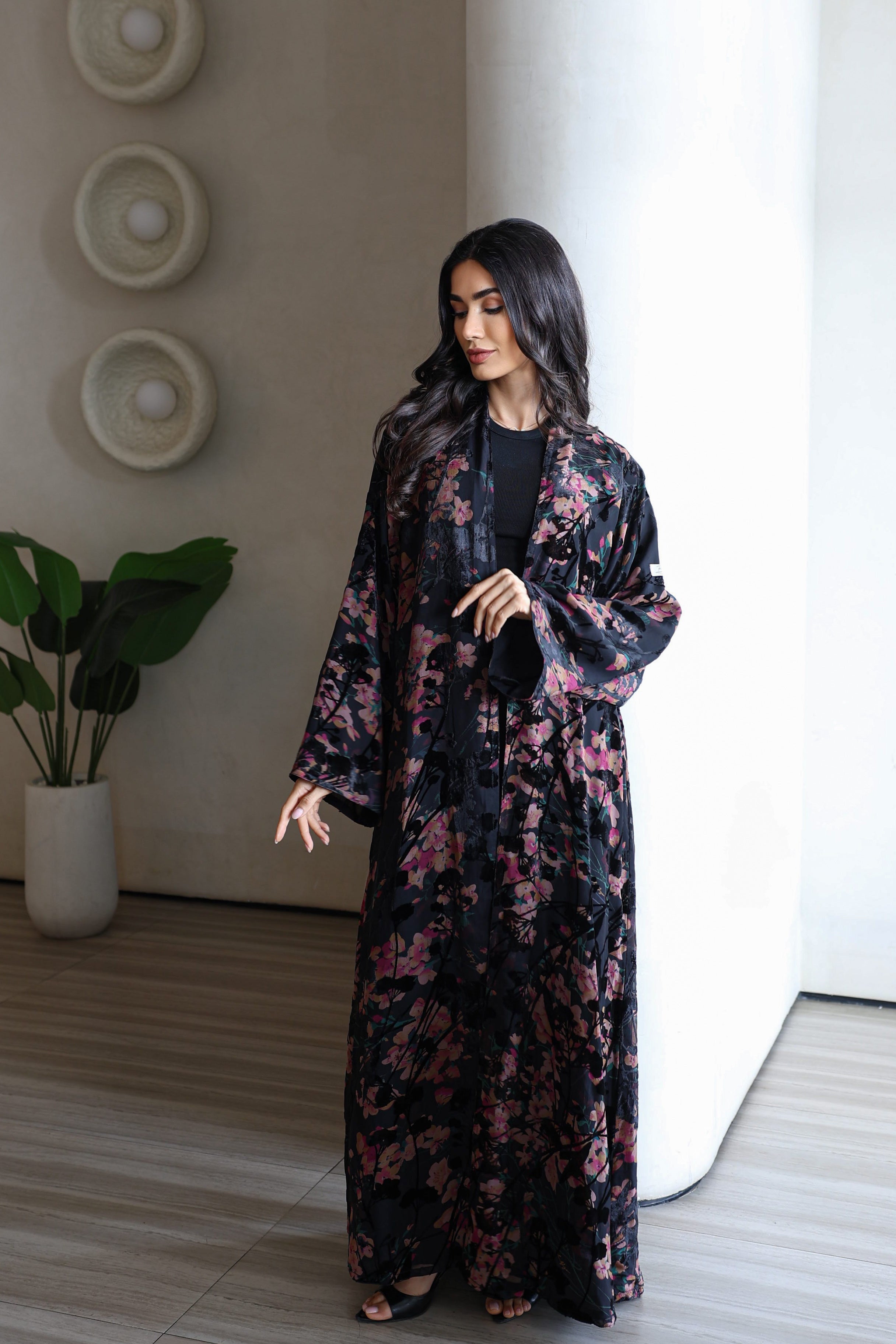 عبايه دبل شيفون مخمل بطبعة ورد مع شيله